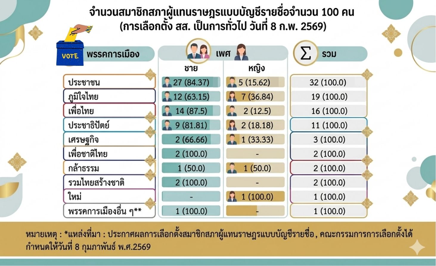 ด้วยเหตุนี้ การวิเคราะห์โครงสร้างของ สส. บัญชีรายชื่อ โดยเฉพาะเมื่อจำแนกตามเพศ จึงไม่ใช่เพียงการอ่านข้อมูลเชิงสถิติ แต่เป็นการทำความเข้าใจว่า พรรคการเมืองไทย “เลือก” ให้ใครเป็นตัวแทน และให้คุณค่ากับความหลากหลายทางเพศมากน้อยเพียงใด