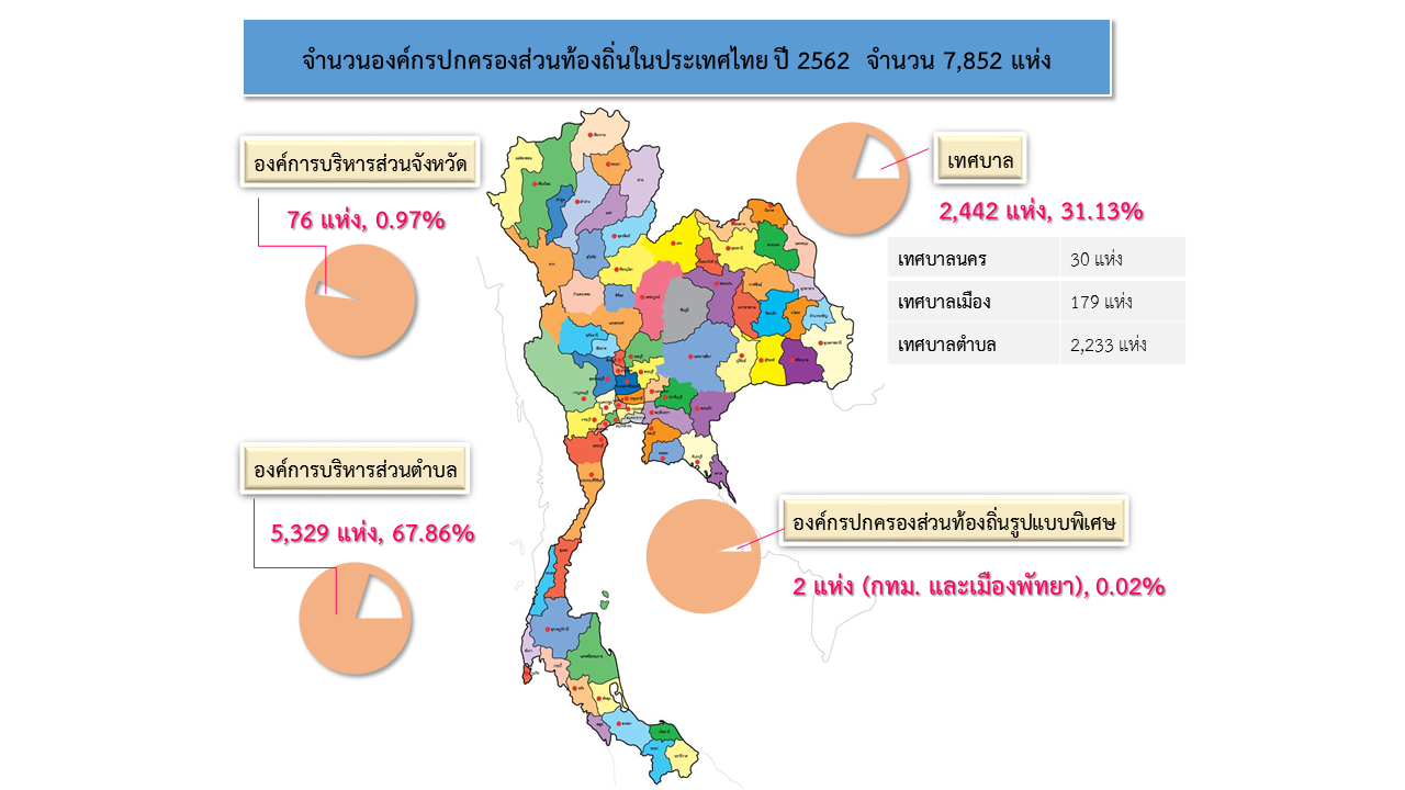 จากข้อมูลสถิติจำนวนองค์กรปกครองส่วนท้องถิ่นในประเทศไทย ของกรมส่งเสริมการปกครองส่วนท้องถิ่น พบว่า ประเทศไทยมีองค์กรปกครองส่วนท้องถิ่น รวมกันทั้งสิ้น 7,852 แห่ง โดยจำแนกออกเป็น องค์การบริหารส่วนจังหวัด 76 แห่ง เทศบาล 2,445 แห่ง และองค์การบริหารส่วนตำบล 5,329 แห่ง (ข้อมูล ณ พฤศจิกายน 2562)
