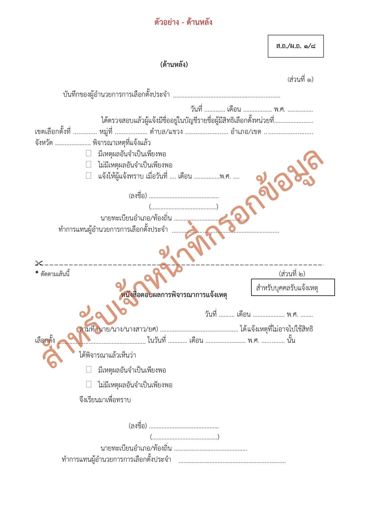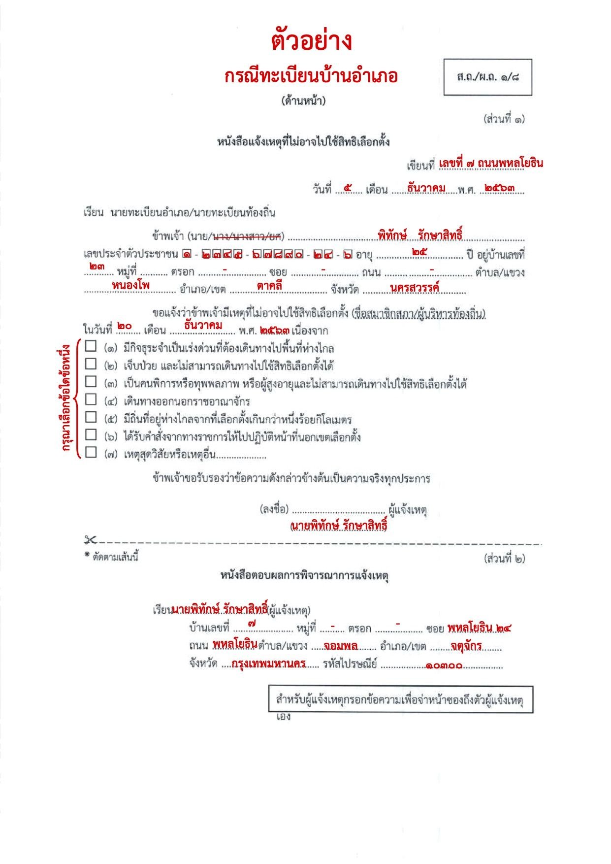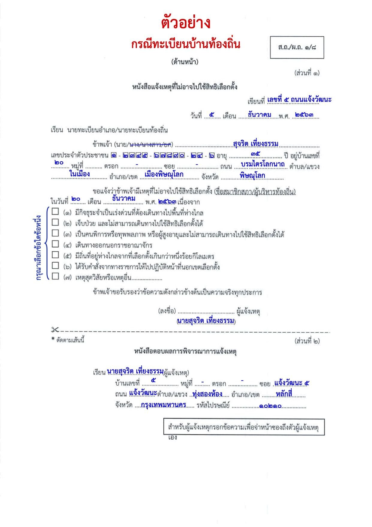 ตัวอย่างที่ 2 : ตัวอย่างการกรอกแบบฟอร์มแจ้งเหตุไม่ไปใช้สิทธิเลือกตั้งท้องถิ่น (ส.ถ./ผ.ถ. 1/8) ถึงนายทะเบียนท้องถิ่น