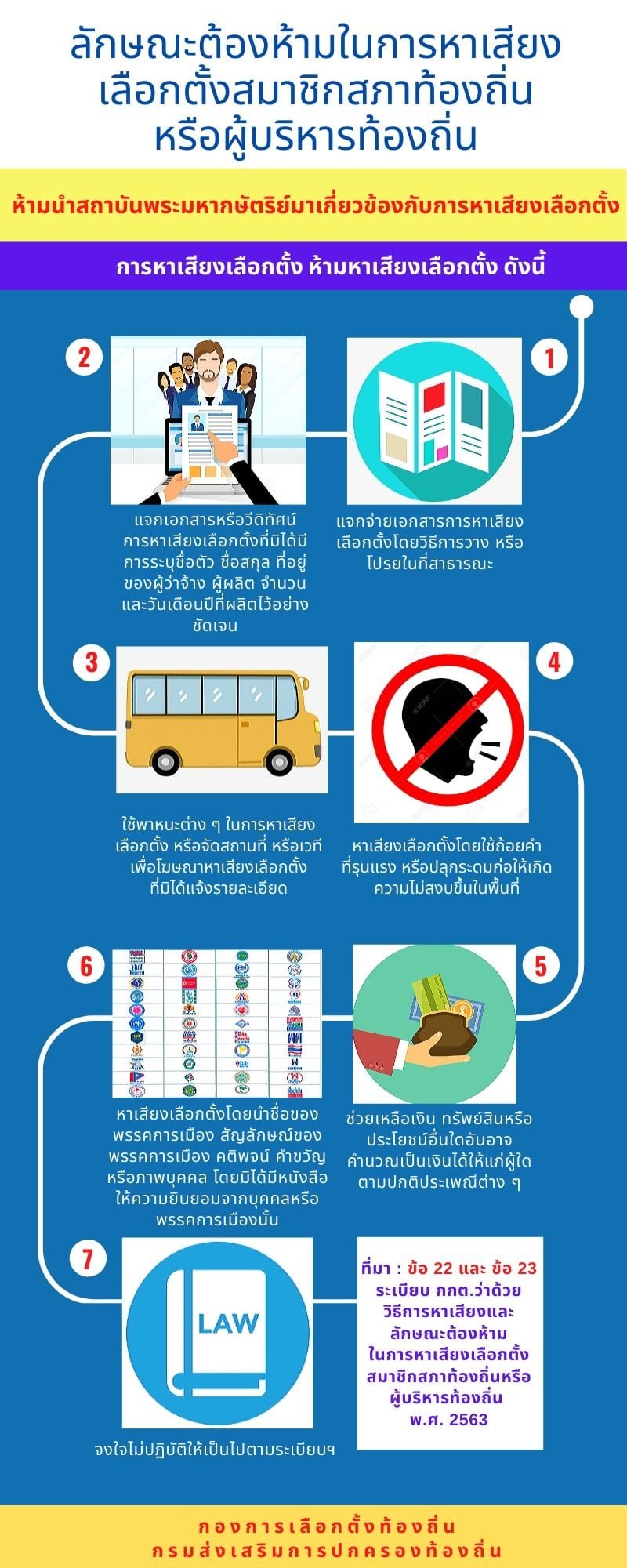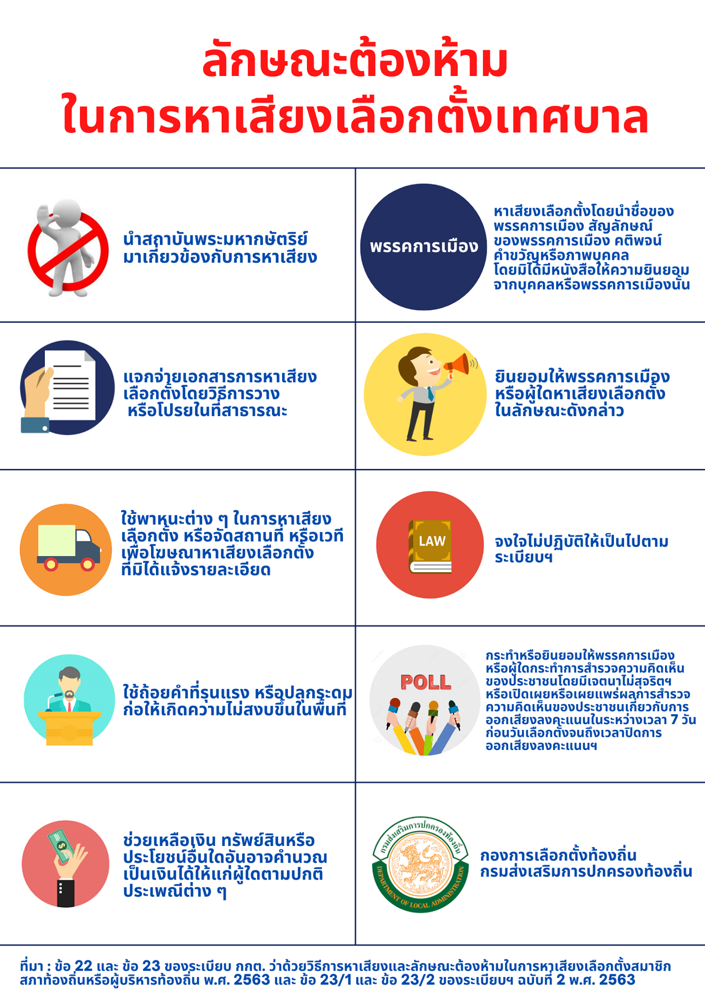 ในการเลือกตั้งสมาชิกสภาเทศบาลและนายกเทศมนตรีที่จะเกิดขึ้นในวันที่ 28 มีนาคม 2564 รู้หรือไม่ ? ระเบียบคณะกรรมการการเลือกตั้งว่าด้วยวิธีการหาเสียงและลักษณะต้องห้ามในการหาเสียงเลือกตั้งสมาชิกสภาท้องถิ่นหรือผู้บริหารท้องถิ่น พ.ศ. 2563 กำหนดรายละเอียดไว้อย่างไรบ้าง สามารถติดตามและอ่านทำความเข้าใจกฎหมายฉบับเต็มได้ที่