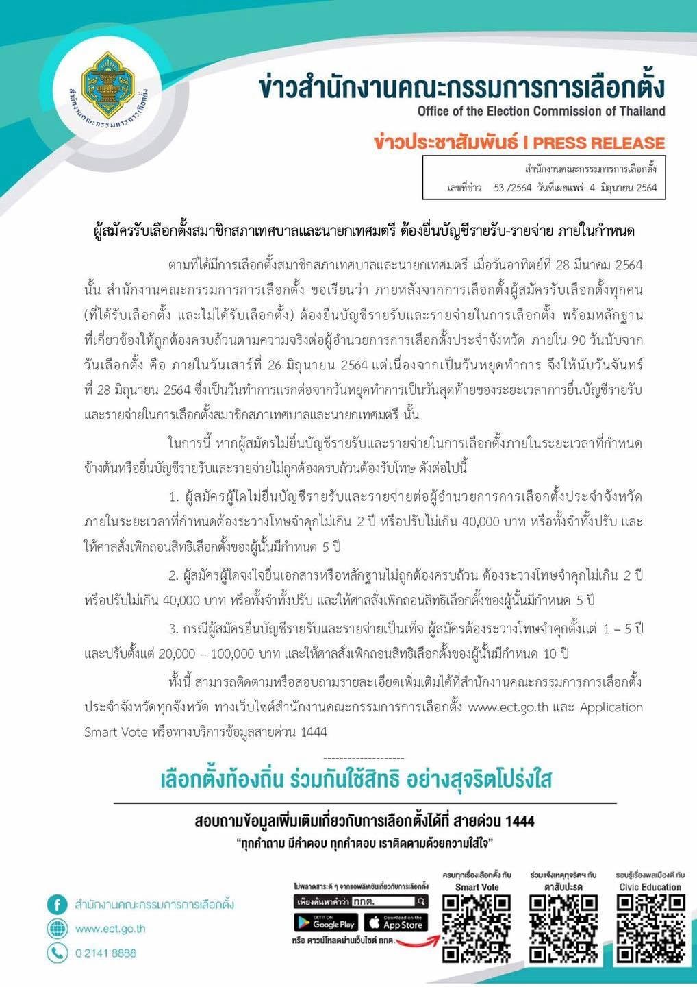 ตามที่ได้มีการเลือกตั้งสมาชิกสภาเทศบาลและนายกเทศมตรี เมื่อวันอาทิตย์ที่ 28 มีนาคม 2564 นั้น สำนักงานคณะกรรมการการเลือกตั้ง ขอเรียนว่า ภายหลังจากการเลือกตั้งผู้สมัครรับเลือกตั้งทุกคน (ที่ได้รับเลือกตั้ง และไม่ได้รับเลือกตั้ง) ต้องยื่นบัญชีรายรับและรายจ่ายในการเลือกตั้ง พร้อมหลักฐานที่เกี่ยวข้องให้ถูกต้องครบถ้วนตามความจริงต่อผู้อำนวยการการเลือกตั้งประจำจังหวัด ภายใน 90 วันนับจากวันเลือกตั้ง คือ ภายในวันเสาร์ที่ 26 มิถุนายน 2564 แต่เนื่องจากเป็นวันหยุดทำการ จึงให้นับวันจันทร์ที่ 28 มิถุนายน 2564 ซึ่งเป็นวันทำการแรกต่อจากวันหยุดทำการเป็นวันสุดท้ายของระยะเวลาการยื่นบัญชีรายรับและรายจ่ายในการเลือกตั้งสมาชิกสภาเทศบาลและนายกเทศมตรี นั้น
