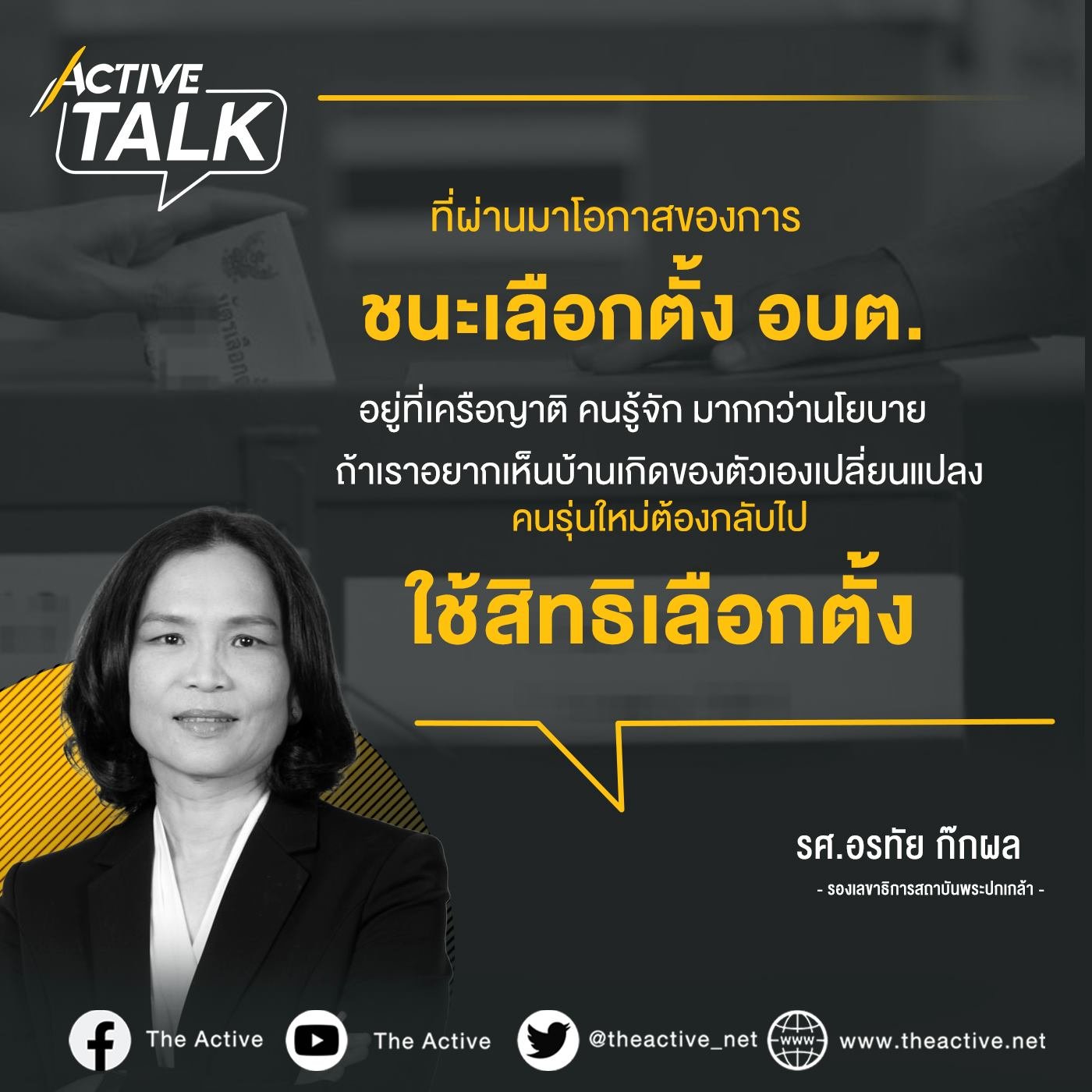 “ที่ผ่านมาโอกาสของการชนะเลือกตั้ง อบต. จะอยู่ที่เครือญาติ คนรู้จัก มากกว่านโยบาย ในขณะที่กลุ่มคนรุ่นใหม่หันมามองเรื่องแนวคิดและนโยบายมากขึ้น เพราะฉะนั้นถ้าเราอยากเห็นบ้านเกิดของตนเองพัฒนา จะทำอย่างไรให้คนรุ่นใหม่กลับไปใช้สิทธิเลือกตั้ง”