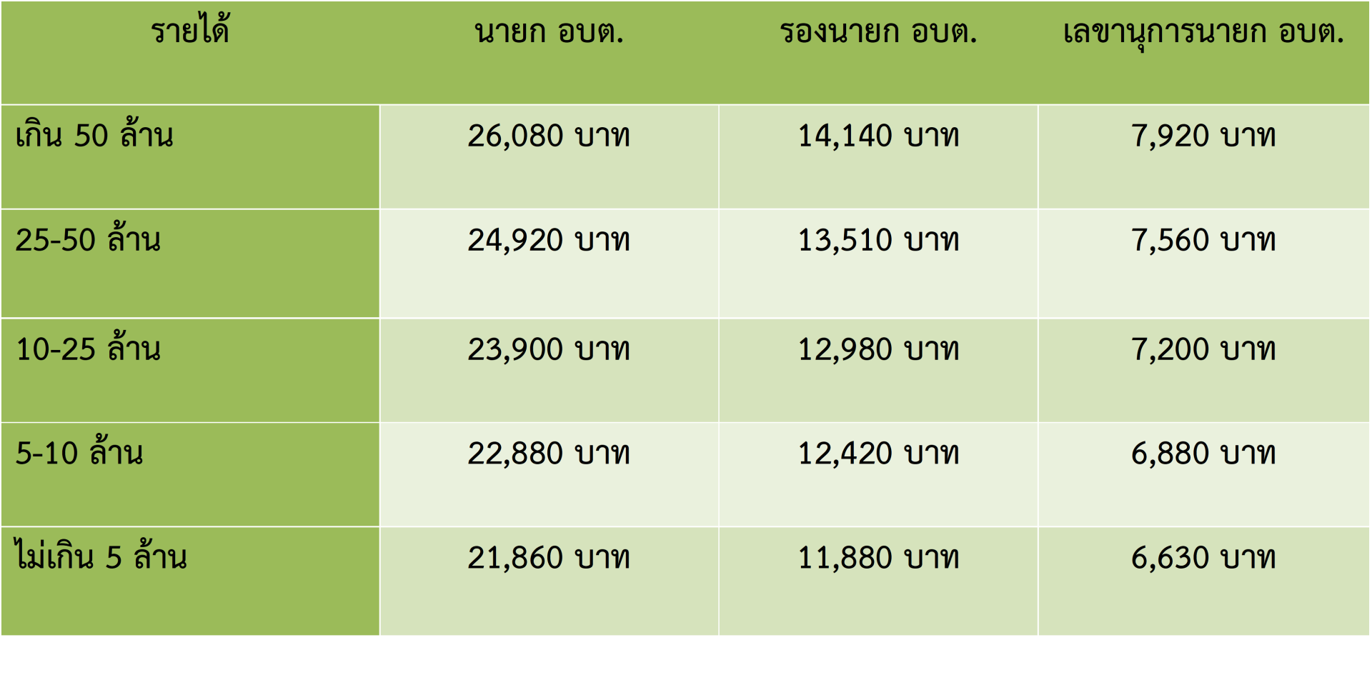 สำหรับ "เงินเดือน" ค่าตอบแทน นายก-รองนายก อบต.จะถูกแบ่งจากรายได้ งบประจำปีจาก อบต. โดยมีค่าตอบแทนแบ่งเป็น ดังนี้